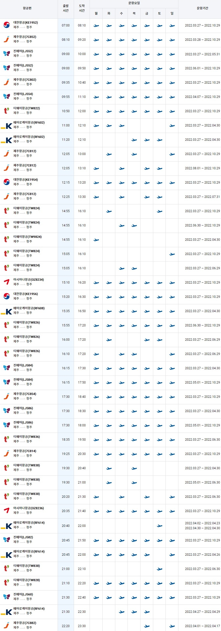 | 제주 --> 포항 공항 비행기 시간표 (2022.03.27 ~ 2022.04.30) (0) | 2022.04.05 |
