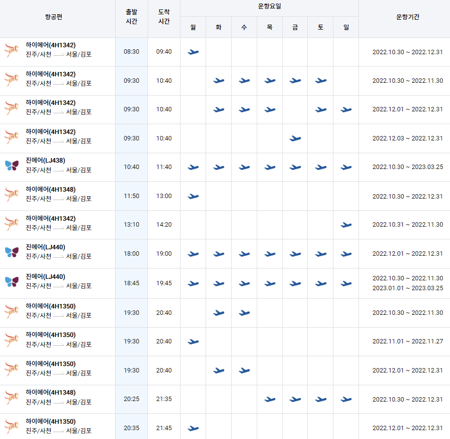 | 사천 --> 제주 공항 비행기시간표 (2022.10.30 ~ 2022.12.31) (0) | 2022.11.26 |