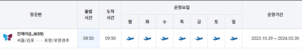 | 서울 김포 --> 포항/경주 비행기 시간표 (2023.03.26 ~ 2023.10.28) (0) | 2023.04.16 |