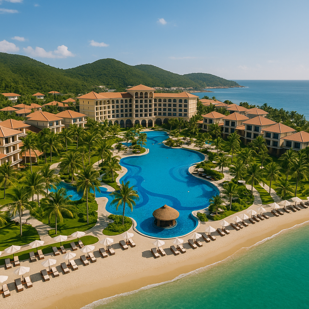 - 특징: 나트랑 깜란 지역에 위치한 대형 리조트로, 워터파크를 갖추고 있어 아이들과 함께하는 여행에 최적화되어 있습니다. 아담한 규모의 워터파크는 물론, 프라이빗 비치와 여러 개의 수영장을 갖추고 있어 물놀이를 좋아하는 가족에게 인기가 많습니다.