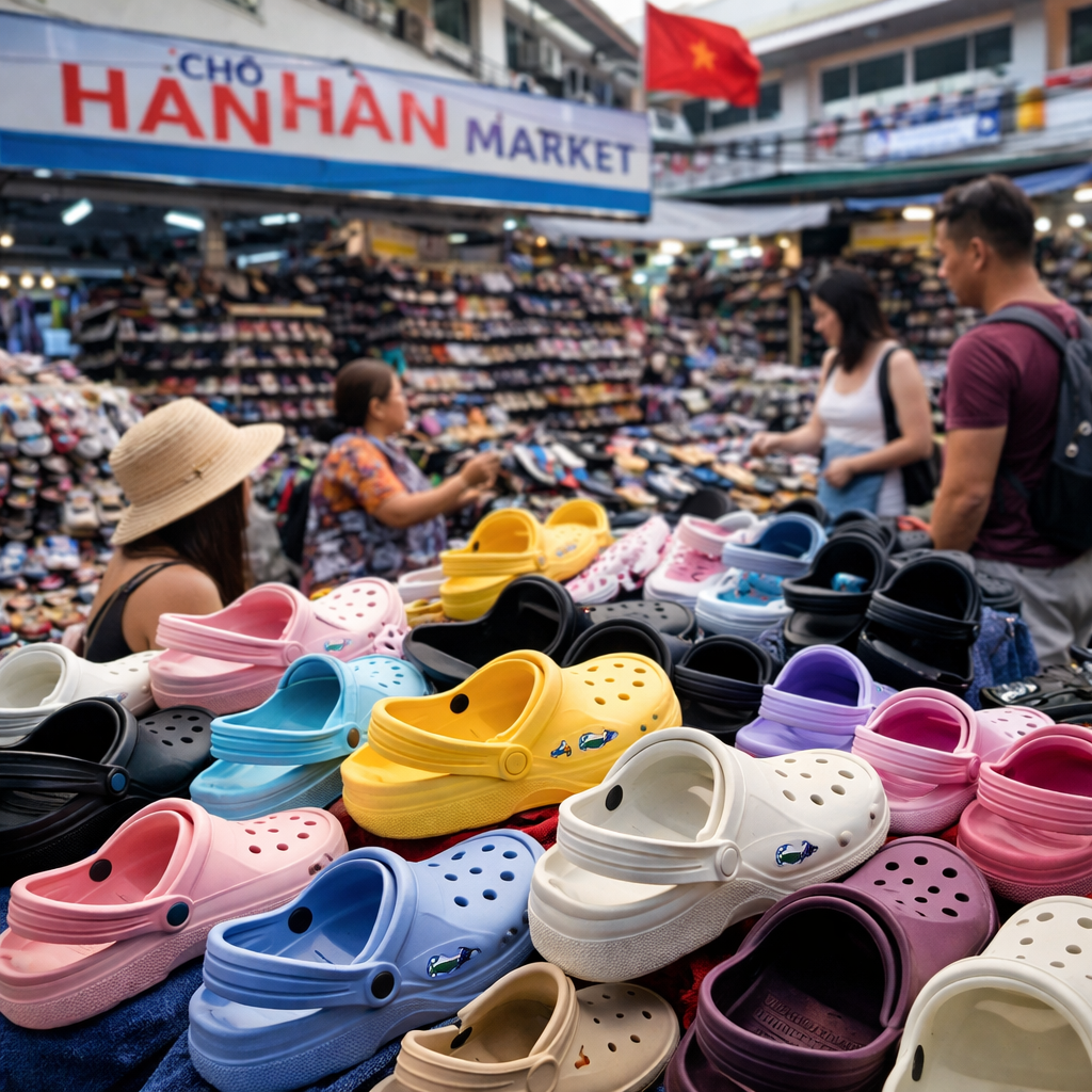 다낭 여행에서 빠지지 않는 코스가 바로 한시장 쇼핑입니다. 특히 가볍고 실용적인 크록스 스타일 샌들은 기념품이나 실사용 아이템으로 인기가 매우 높습니다. 정품보다 훨씬 저렴한 가격에 구매할 수 있지만, 품질과 가격이 제각각이라 제대로 알고 사야 후회가 없습니다.
