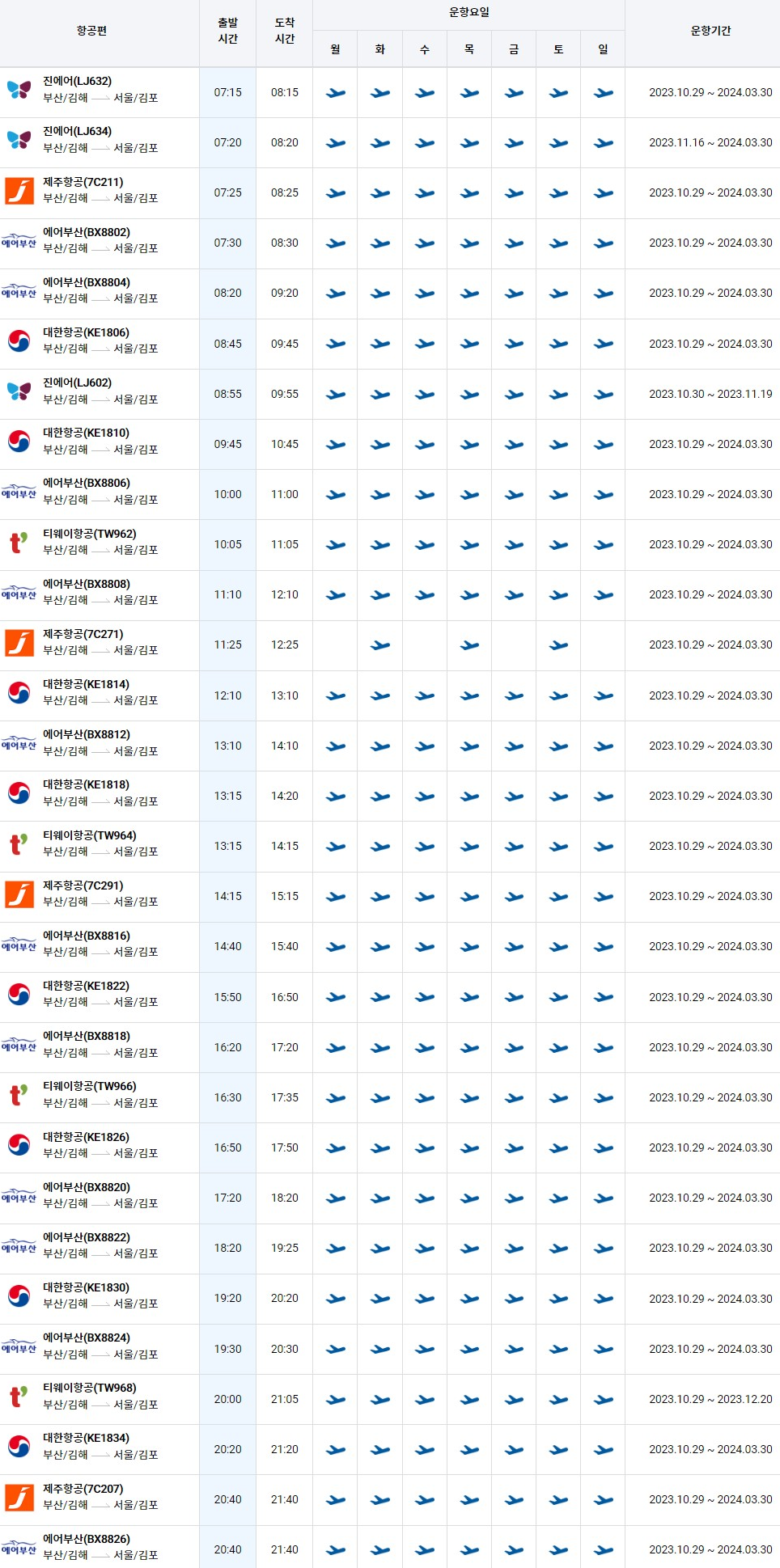 부산/김해공항 -> 서울/김포공항 비행기 시간표 (2023.10.29 ~ 2024.03.30)