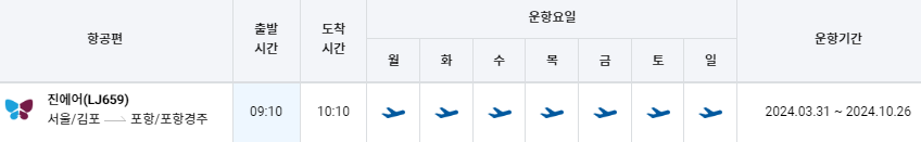 서울/김포 -> 포항/포항경주 비행기 시간표 (2024.03.31 ~ 2024.10.26)